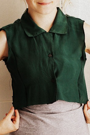 Try it on to check it fits, trim the bottom / armholes if necessary. Zig-zag over everything if you so desire. Hem the armholes, trim all the loose threads etc. etc. Looking at this picture, I probably should have added another button SO if it is a little gaping around the boob-area, fix this now.