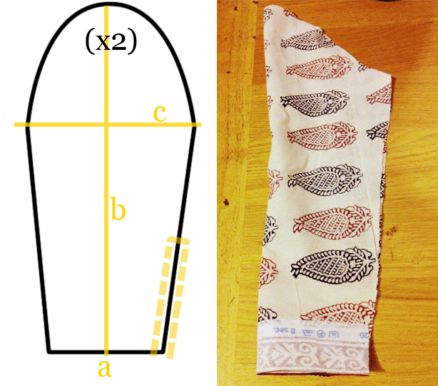 Cut two sleeve pieces. Fold each piece in half lengthways (right sides together) and sew along the side edge until you reach the yellow dotted line. At that point, separate the edges and hem them by rolling them over once (only a little) and sewing.